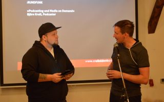 Björn Krull, Podcaster von randgruppenfunk.de, sprach über seinen Eindruck der heutigen Medienwelt und die Möglichkeiten von Podcasts. Wichtige Punkte waren entsprechend »Inhalte on demand« als Mittel, um sich an die individuellen Hörgewohnheiten moderner Konsumenten anzupassen, oder das »Hausmacher-Radio« als Möglichkeit, das eigene Hobby zur Einnahmequelle zu machen.
